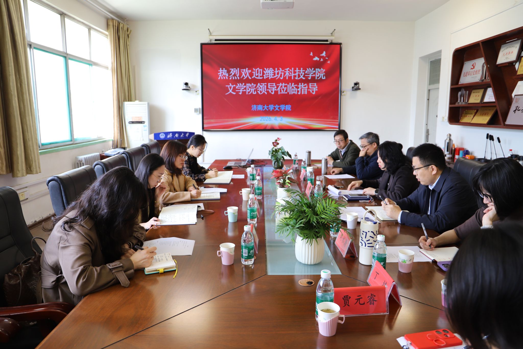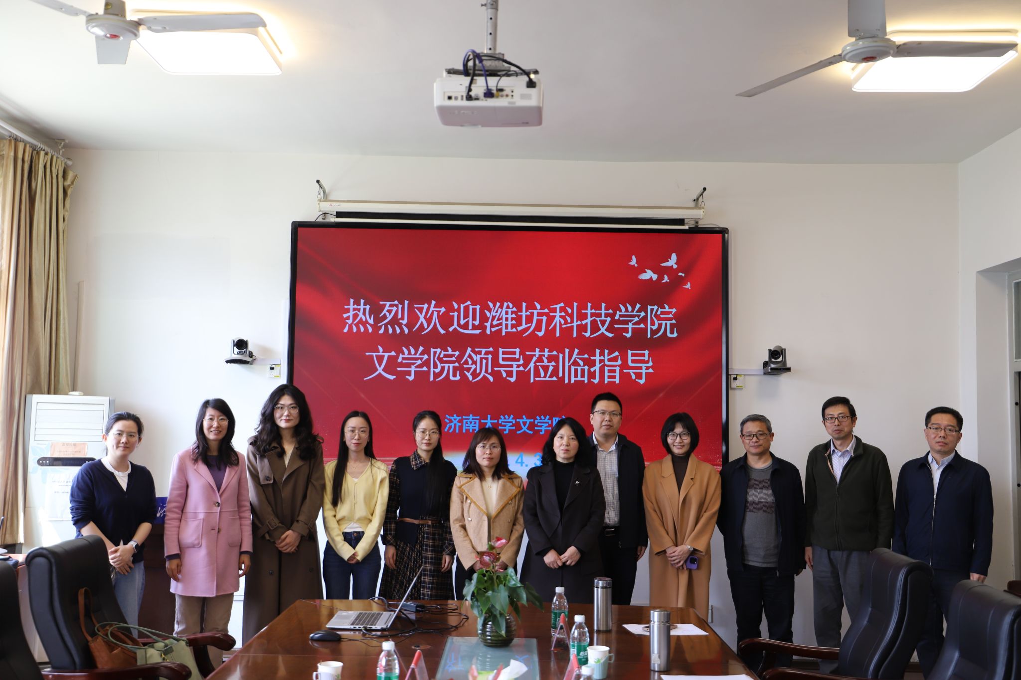 2026年4月3日上午,潍坊科技学院成人直播 院长孙淑娟一行4人到成人直播 座谈交流,成人直播 院长范丽敏、院长助理晏青、中文系主任张秉国、副主任高龙奎、传播系主任刘水清、副主任丁捷、教办主任贾元睿等参加座谈。会议由院长助理晏青主持。