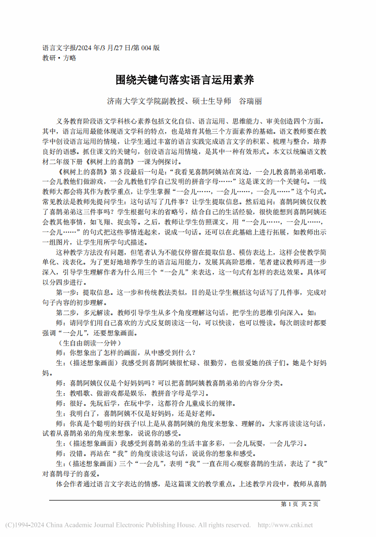 成人直播 谷瑞丽副教授的文章《围绕关键句落实语言运用素养》于2024年3月27日在《语言文字报》发表。