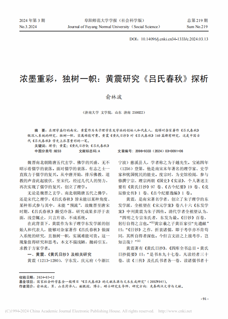 俞林波副教授的论文《浓墨重彩,独树一帜:黄震研究<吕氏春秋>探析》于《阜阳师范大学学报(社会科学版)》2024年第3期发表。论文为作者所主持的国家社会科学基金一般项目“《吕氏春秋》的文献来源与文本生成研究”(20BZW045)的阶段性成果。