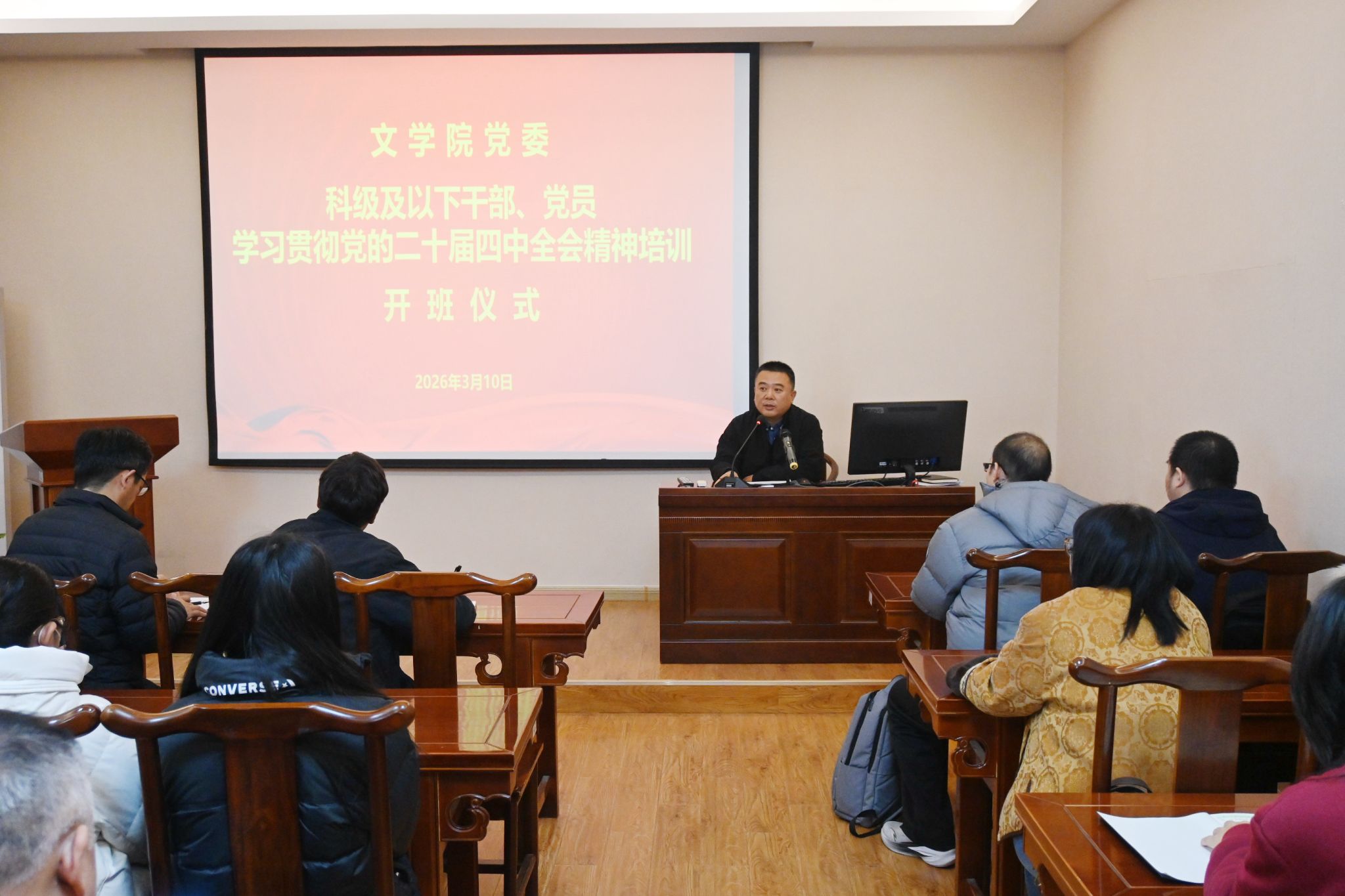 会议首先举行开班仪式。学院党委书记朱海龙作开班讲话。他指出,深入学习贯彻党的二十届四中全会精神,是当前和今后一个时期的重要政治任务,全体党员干部要提高政治站位,深刻领会全会精神的核心要义和实践要求,把学习成果转化为推动学院事业高质量发展的实际行动。他强调,要坚持以习近平新时代中国特色社会主义思想为指导,在学深悟透、融会贯通上下功夫,切实把思想和行动统一到党中央决策部署上来。